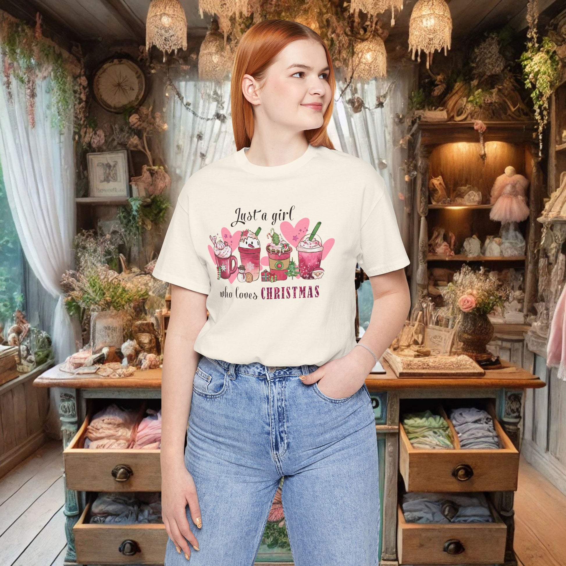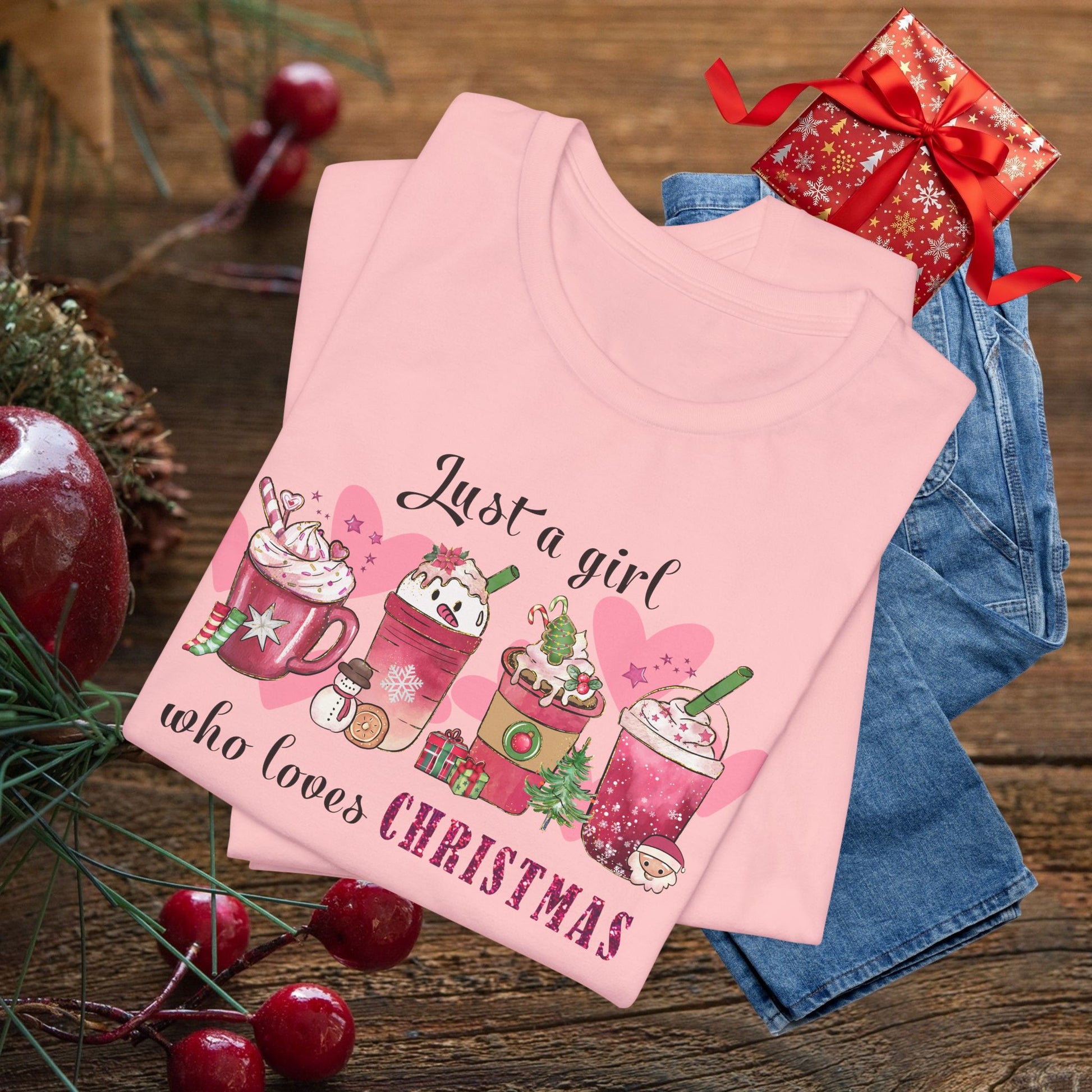 A lightweight, soft cotton tee with a warm, festive heart. This crew-neck shirt shows a row of rosy holiday drinks and treats beneath the phrase “Just a girl who loves CHRISTMAS,” evoking cozy mornings at a café and glittering walks through town lights. It sits close to the body without feeling tight, layer-ready under sweaters or worn solo with a scarf.