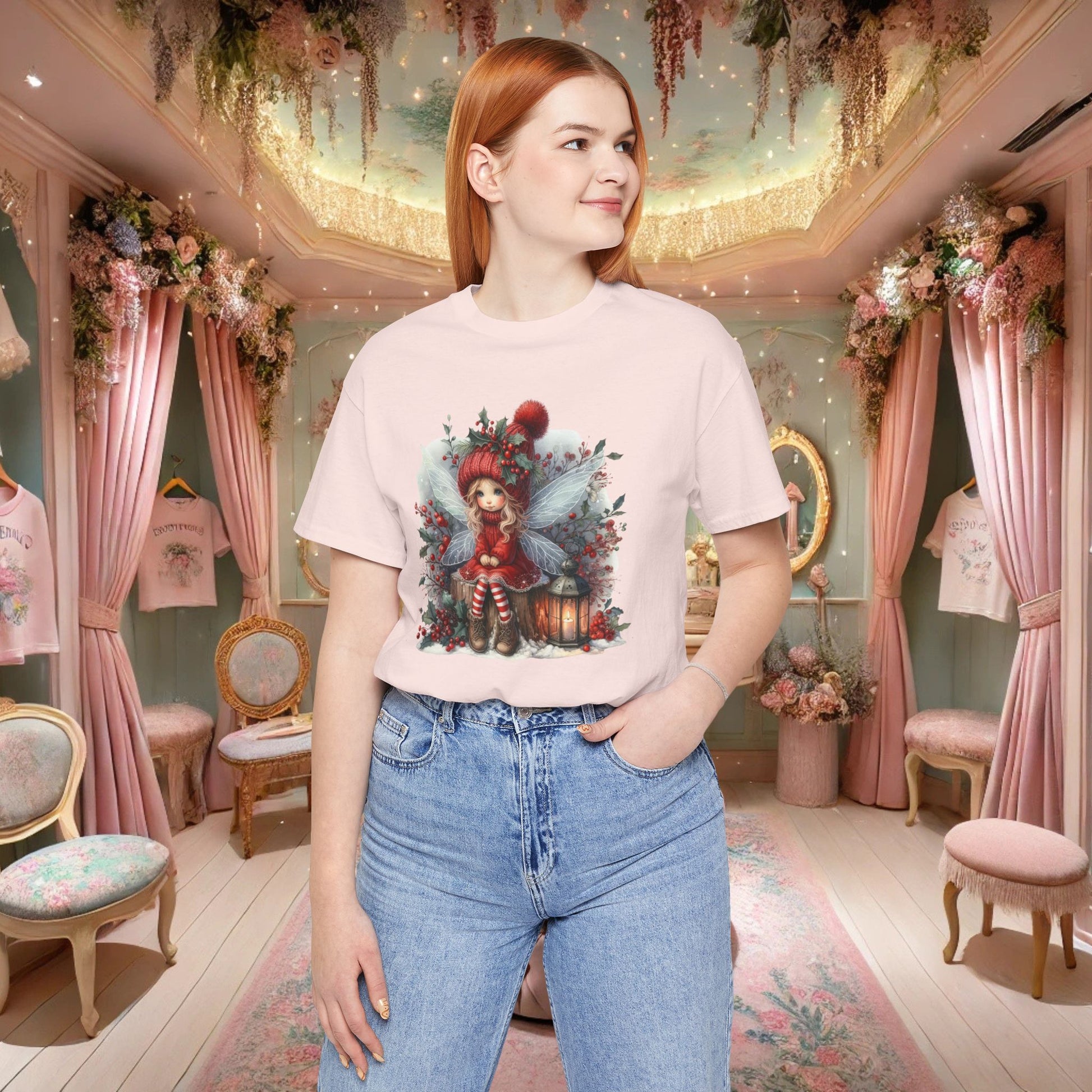 Gentle and whimsical — this lightweight jersey tee carries a soft illustration of a tiny winter sprite cradled among holly, pine sprigs, and a glowing lantern. The artwork’s muted reds, greens, and vintage tones sit comfortably on breathable Airlume combed cotton, making the shirt feel like a quiet evening walk through snow-dusted woods. Wear it layered under a cardigan for slow mornings with hot tea, or alone while wrapping presents and stringing lights. The crew neckline and retail fit keep the silhouette tidy, while the tear-away label and stabilized shoulders promise longwear comfort. This tee resonates with anyone who loves cozy, cottage-core winter scenes and handcrafted holiday moments.