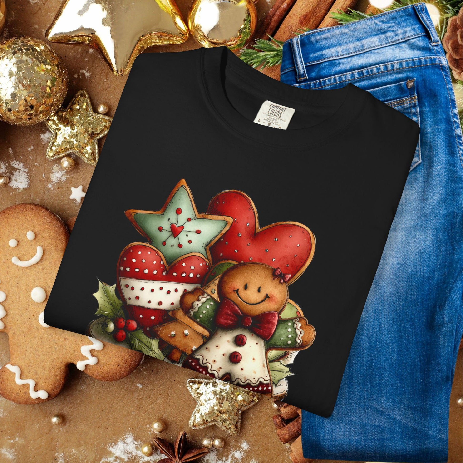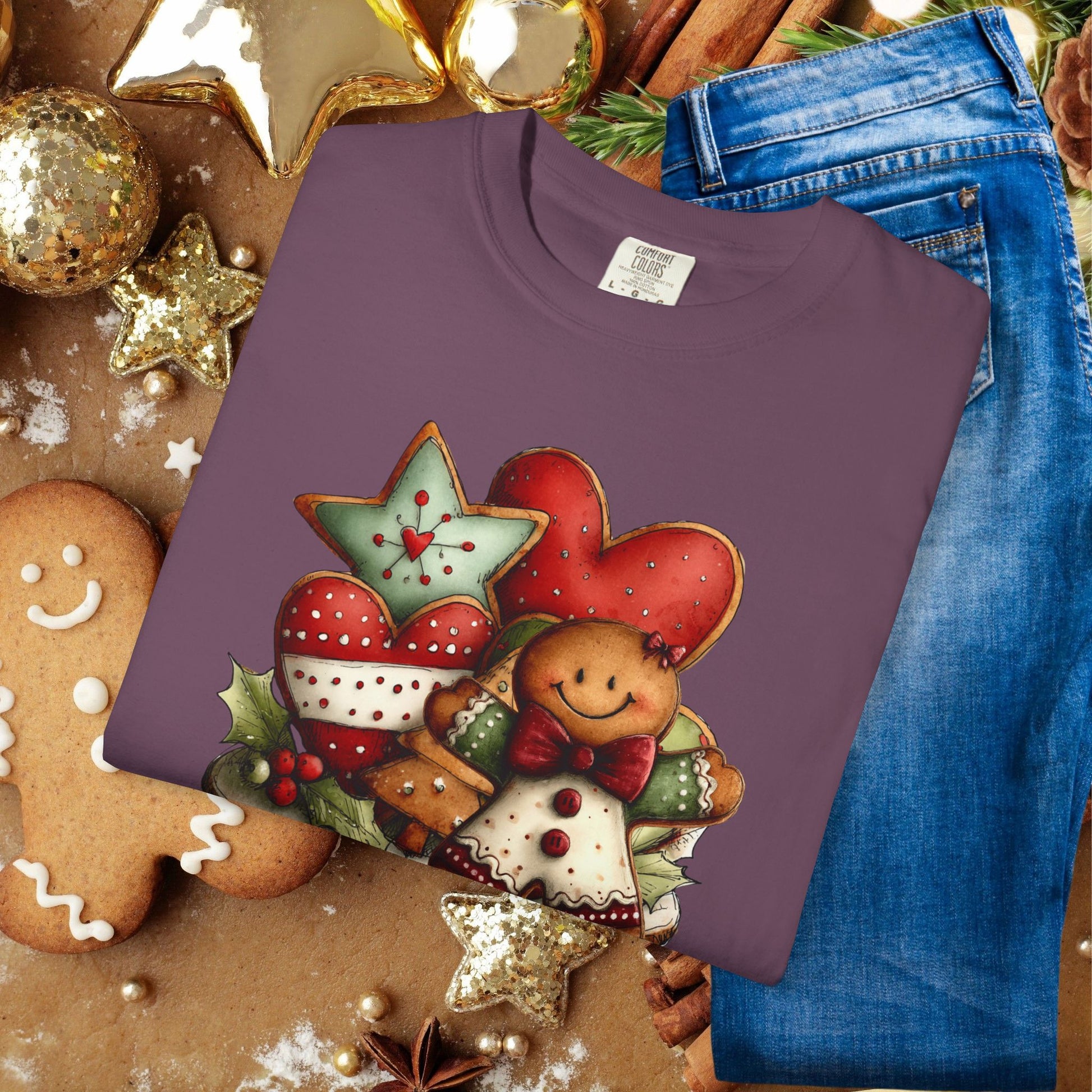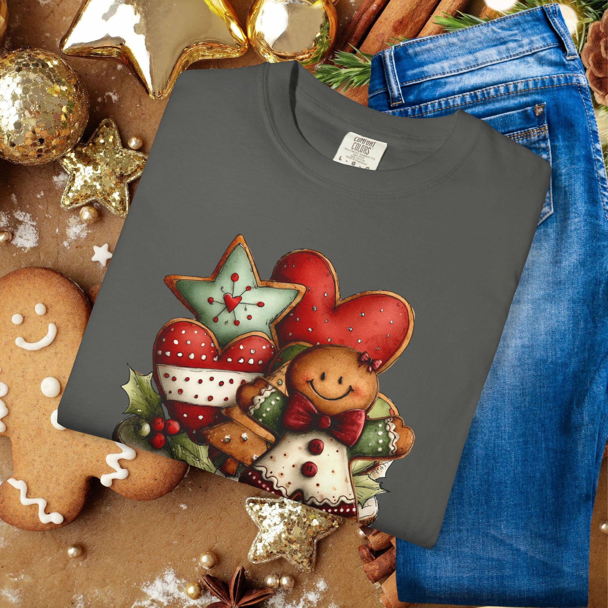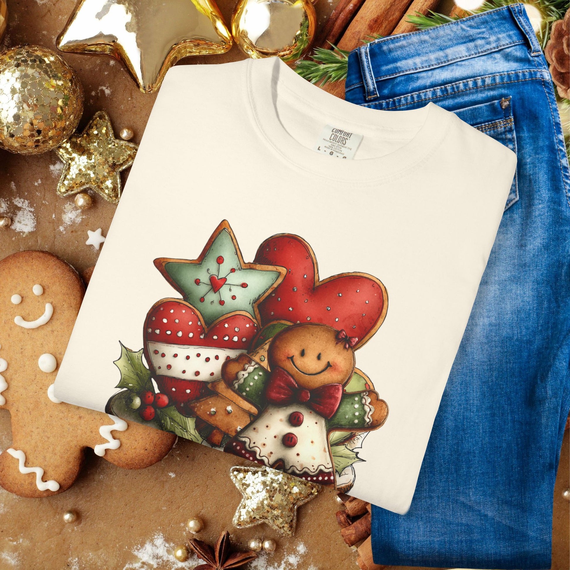A soft, garment-dyed tee that brings cozy holiday kitchen vibes to everyday wear. The front artwork — a warm cluster of gingerbread cookies, heart cookies, and star-shaped treats — looks hand-painted and slightly worn-in, matching the shirt’s lived-in feel. Wear it while wrapping presents, baking late-night cookies, or unwrapping memories with family.