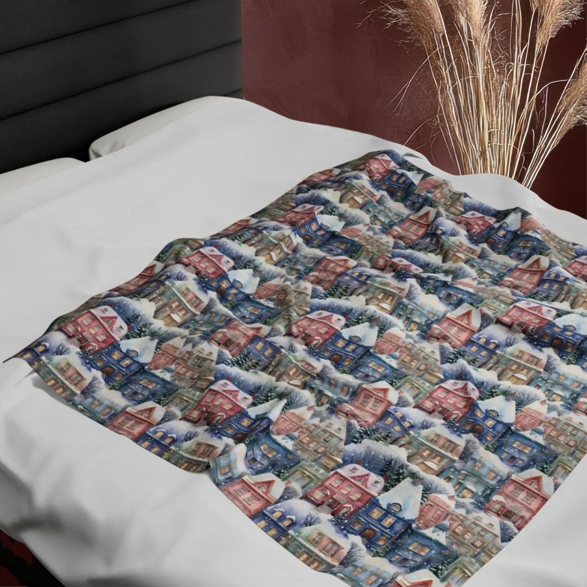 Cozy Christmas Village Blanket, Snowy Cottage Winter Throw