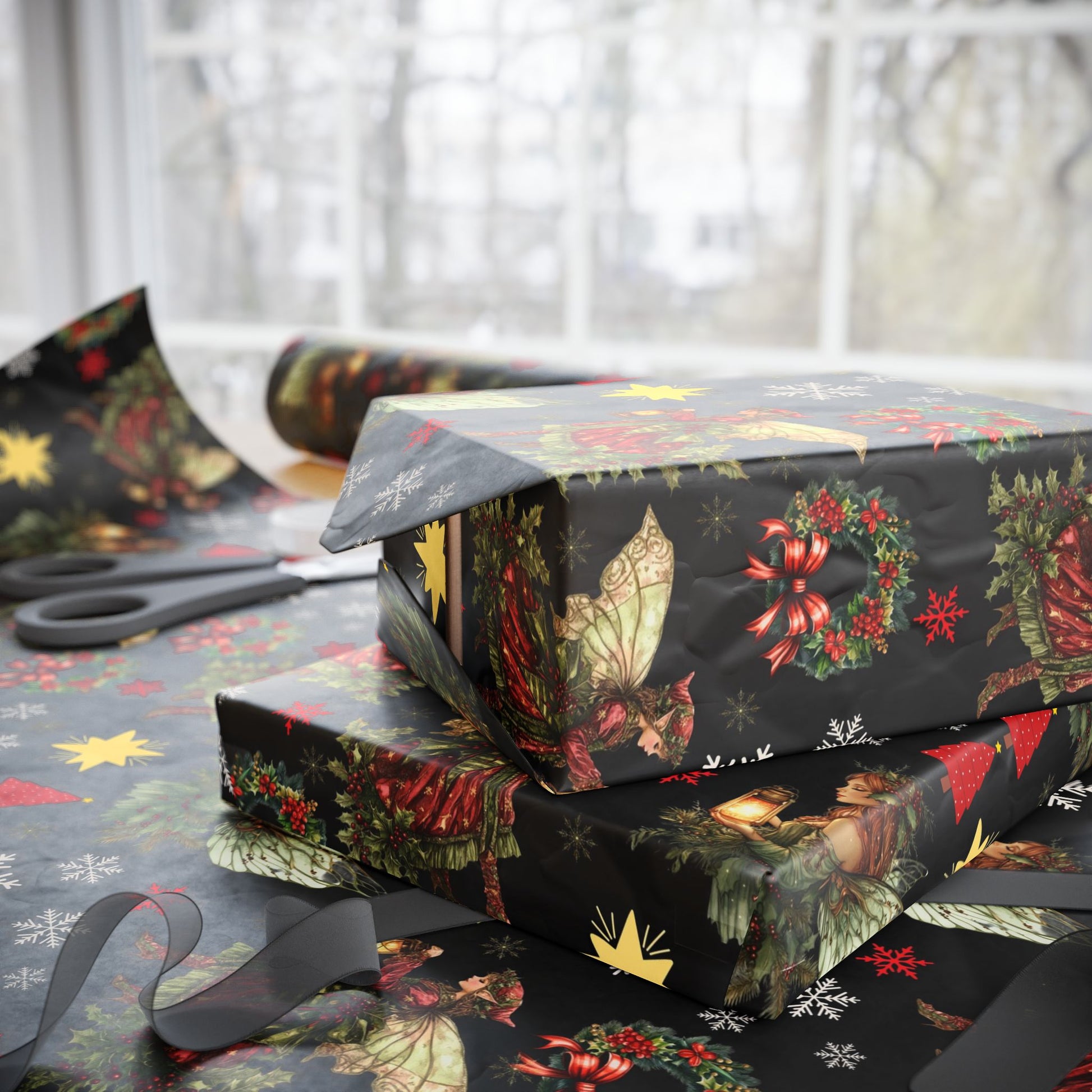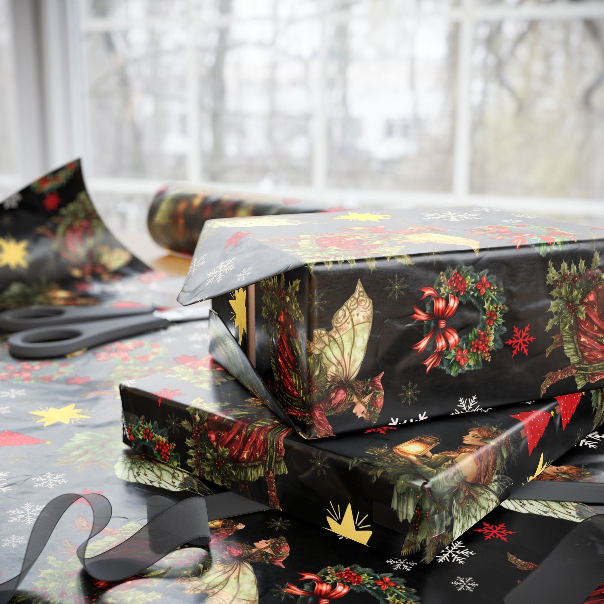 Handcrafted-looking holiday wrapping paper that brings a warm, slightly rustic spell to gift-giving. Deep black backgrounds make wreaths, stars, holly and vintage ornaments pop in rich reds and golds. The print reads like a page from an old-world holiday market — cozy, slightly mysterious, and full of seasonal charm.
