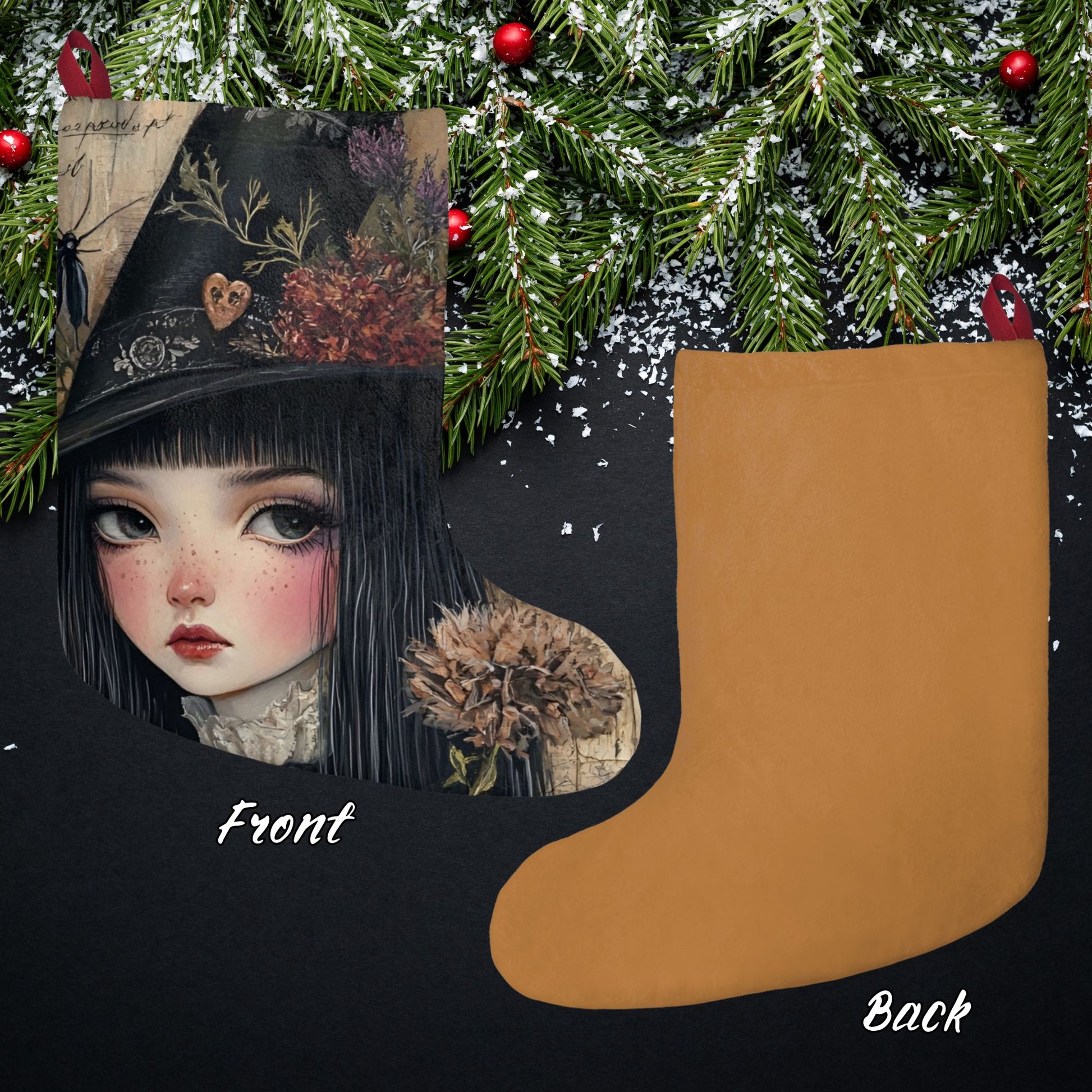 Bring a touch of magic to your holiday season with this personalized Christmas stocking. Featuring a stunning gothic-inspired girl illustration and your chosen name, this stocking is the perfect way to add an enchanting charm to your Christmas decor.