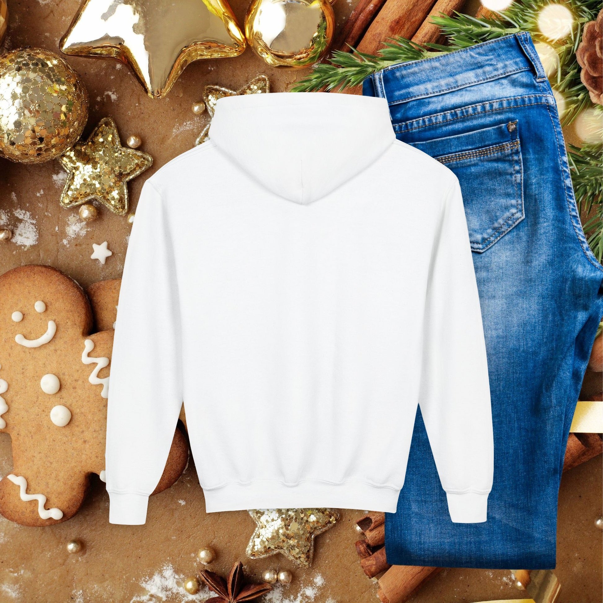 Soft, cozy, and quietly festive — this youth hoodie wraps little ones in holiday calm. A sweet, hand-drawn elf sits center chest, cradling a tiny snowman and surrounded by muted greens and warm cinnamon tones.