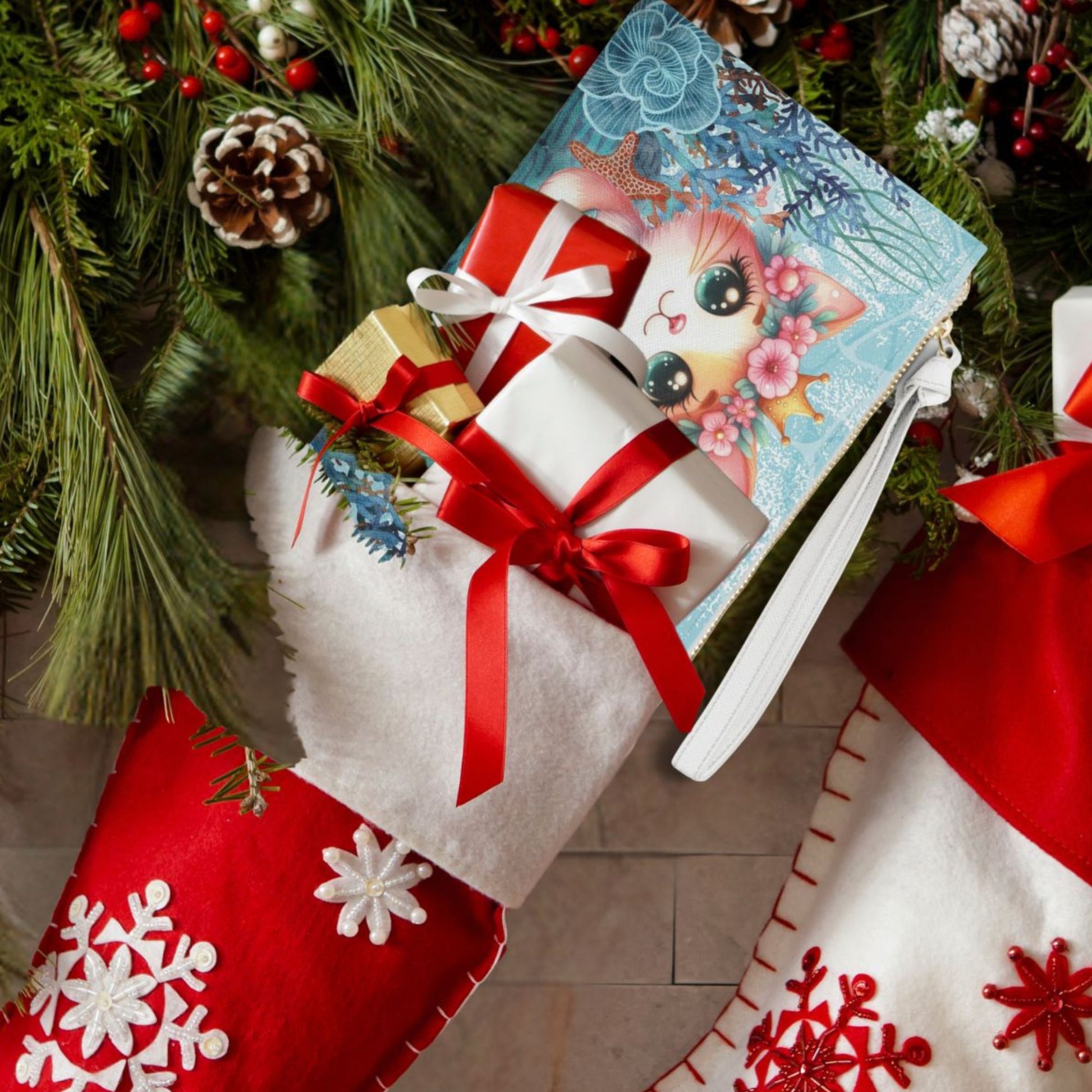This Mermaid Cat Makeup Bag is perfect for the whimsical and stylish individual who loves to keep their cosmetics organized. The Saffiano pattern finish gives it a luxurious feel, while the gold colored metal zipper adds a touch of elegance. With two compartments and a small pocket inside, this makeup bag is both functional and fashionable. The wrist strap allows for easy carrying, making it ideal for travel or everyday use. Perfect for cat lovers and those who enjoy mermaid-themed accessories.